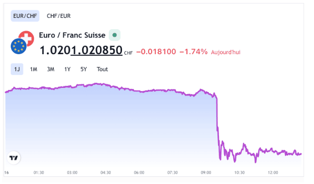C’est l’agitation dans toutes les banques centrales afin de lutter contre une inflation galopante. A la surprise générale, la BNS a annoncé ce matin une remontée de son taux directeur de 0,50%, pour le porter à -0,25%. Tandis que la bourse suisse plonge, le franc suisse profite pleinement de cette mesure pour remonter pour repasser sous les 1,02 ce matin.