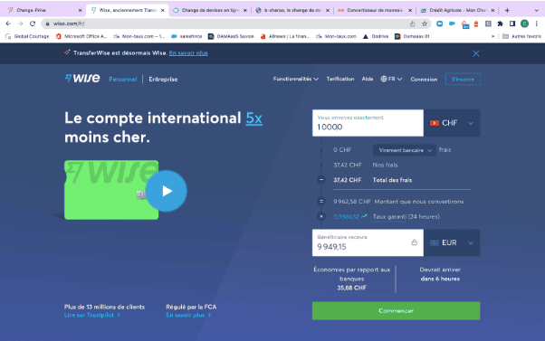 Wise, ex-Transferwise qui existe depuis 2011 est un acteur mondial du transfert d’argent qui compte plus de 10 millions d’utilisateurs à travers le monde. Devenu Wise en 2021 avec l’intégration de nouveaux services (carte multidevises, iban dans la monnaie du paiement), il a fait sa réputation sur les conditions de change très favorables et la possibilité de bloquer un cours de change en ligne. Le service est bien connu des travailleurs frontaliers et présente de nombreux avantages pour permettre aux travailleurs frontaliers de bénéficier du meilleur taux de change.