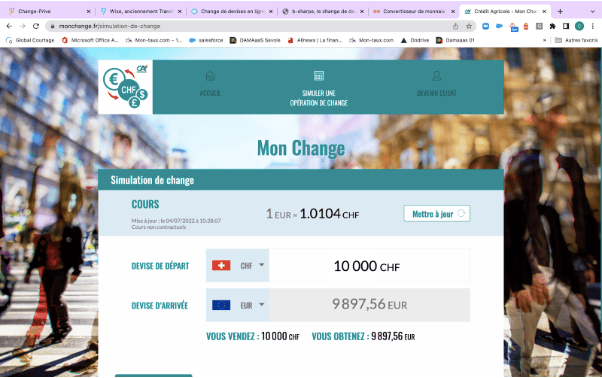 Ce comparatif, non exhaustif, des services de change en ligne, a été réalisé sur la base des conditions affichées sur le site web de chaque opérateur le 04/07/2022 entre 10h40 et 10h41 pour un montant de 10’000.- CHF. Revolut qui propose également une solution très compétitive pour les frontaliers, n’a pas été intégré dans cette comparaison car il nécessite de souscrire à un abonnement mensuel et une offre de service différente.