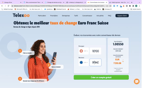 Telexoo est une PME Genevoise basée à Lancy qui a vu le jour en 2013. Elle a été créée par Michael Desforges et se présente comme un service de change à taille humaine. Telexoo met en avant des conditions de change compétitives ainsi que la disponibilité de ses collaborateurs. Telexoo applique un taux de change à réception de votre transfert d’argent et vire les fonds sur le compte que vous avez désigné. Il faudra les contacter pour pouvoir fixer un cours de change en direct.