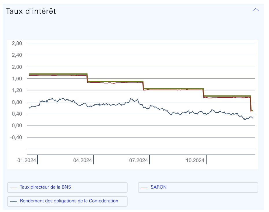 Suivant la tendance impulsée par la BNS, les taux baissent en Suisse en cette fin d’année. Sur la graphique ci-dessous (que vous pourrez facilement retrouver sur le site de la BNS),vous pourrez constater que l’orientation à la baisse est engagée.